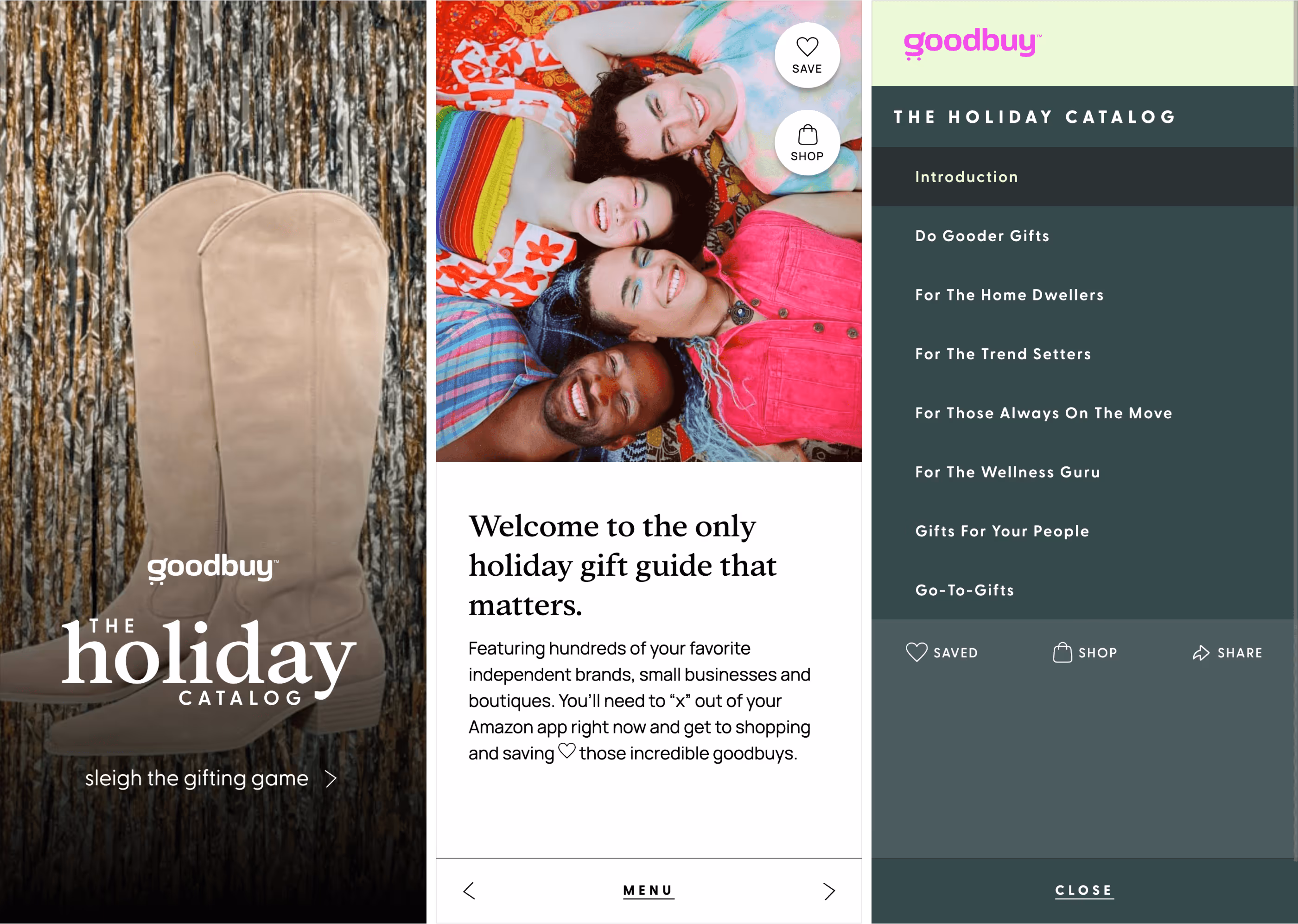 Goodbuy was motivated to provide alternative channels to empower its user base to explore gifting options engaging and immersively. They wanted to create a digital Holiday Catalog microsite to serve as a resource for shoppers. We were on a very short timeline for this campaign and needed to complete the microsite with enough time to distribute it before the upcoming holidays.