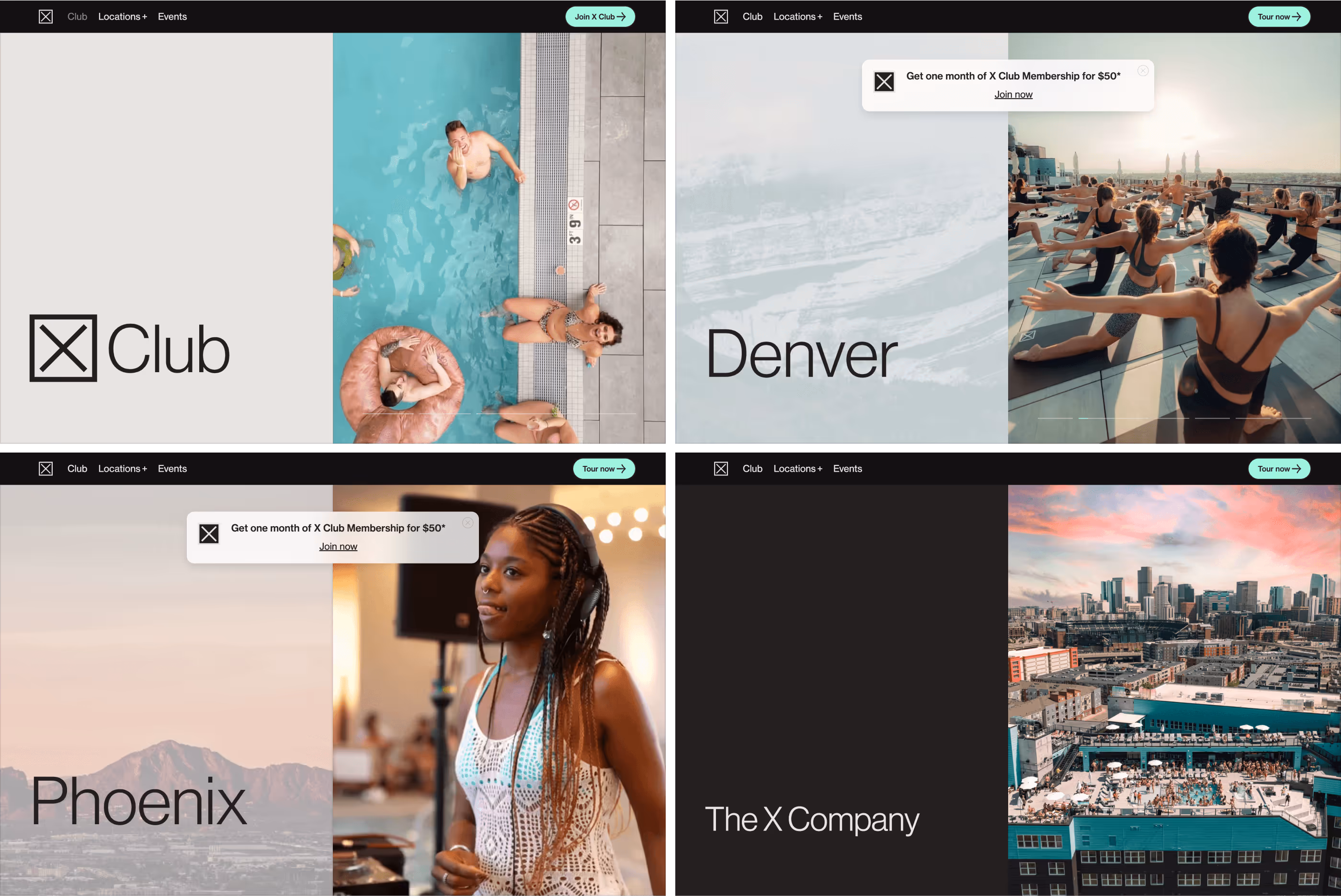 The first impression of the marketing website for X Co. needed more of the energy portrayed by the brand on social media and in real life at the clubs. The design team wanted to rethink the hero currently in place.